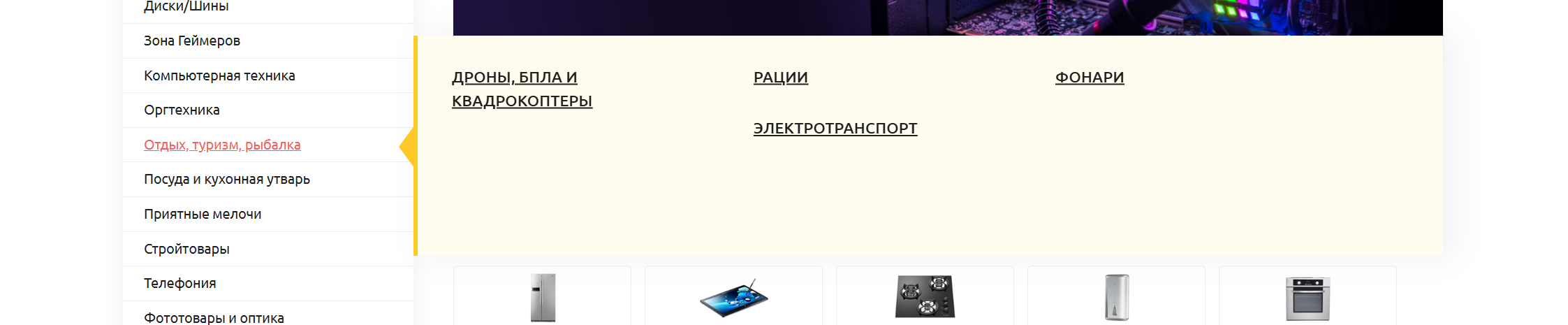 Фактический результат: Элементы в саб-меню категории "Отдых, туризм, рыбалка" выровнены хаотично, что создает визуальный беспорядок.