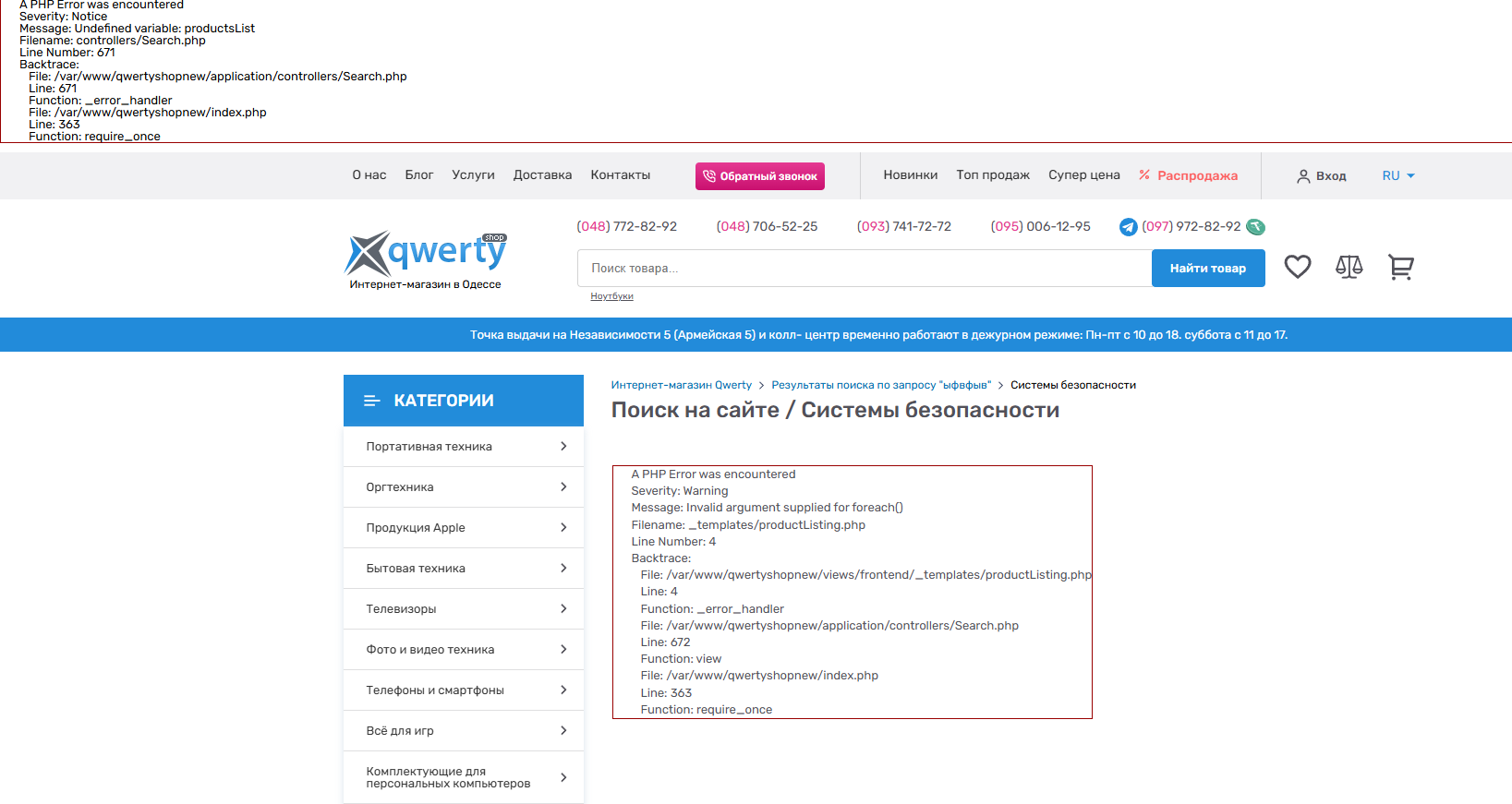 Фактический результат: Если зайти в раздел "Системы безопасности" место ожидаемого товара можно увидеть сообщение об ошибке в виде кода