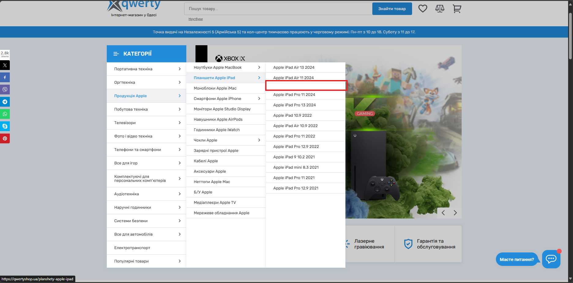 3) Навести курсор мыши на пункт "Планшеты Apple iPad" в выпадающем списке