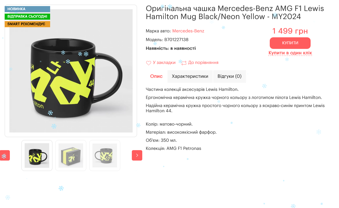 1. Помилка опису товару англійською мовою проти опису українською Замість жовтого коліру вказано синій. Надійна керамічна кружка простого чорного кольору з яскраво-синім принтом Lewis Hamilton 44. Принт жовтий.