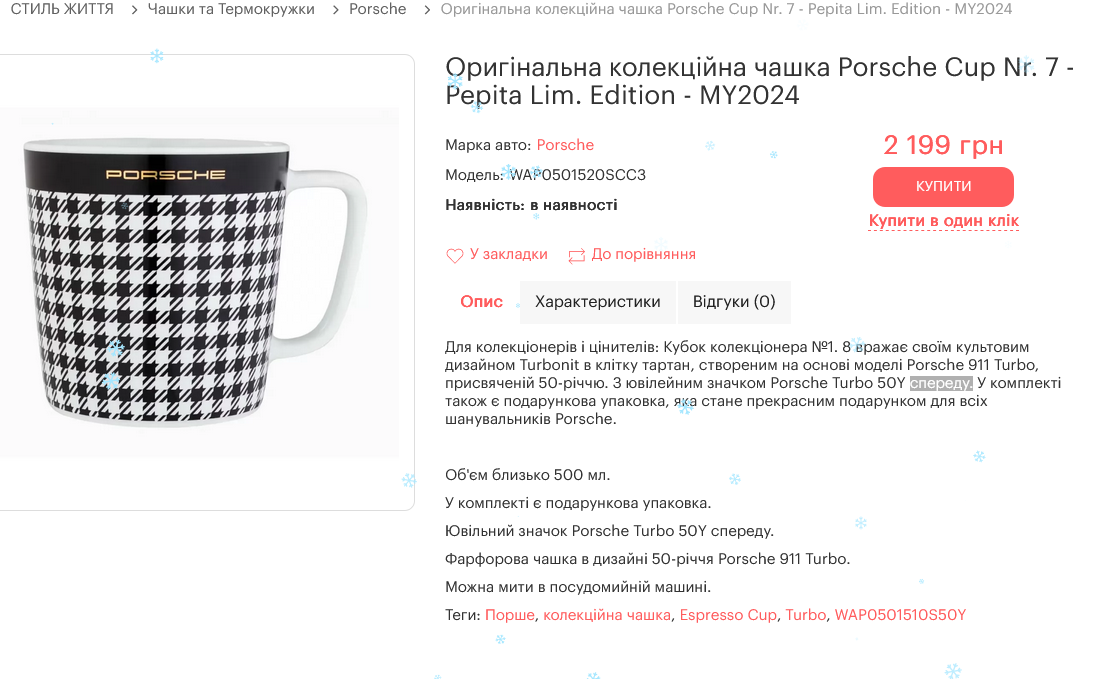 Помилка у перекладі на українську мову Колекційна чашка Porsche Cup Nr. 7 - Pepita Lim. «Ювільний значок Porsche Turbo 50Y спереду». Треба – «Ювілейний та попереду».