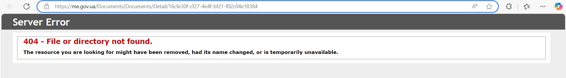 Фактический результат: Отображается ошибка "404 - File or directory not found." при клике на ссылку "Повідом про корупцію" на всех страницах, кроме главной