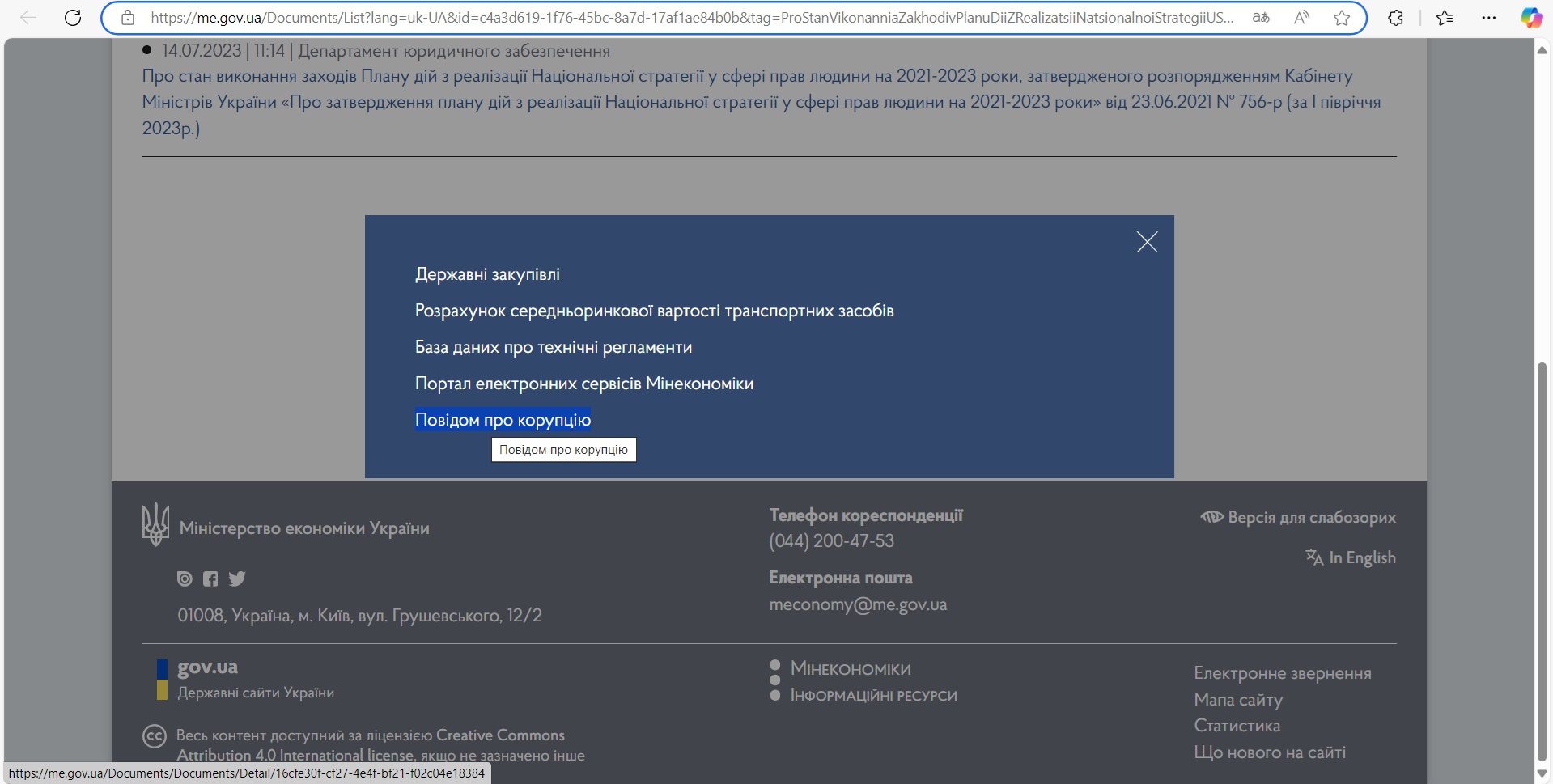 Ожидаемый результат: Ссылка "Повідом про корупцію" ведёт на корректную страницу с соответствующим содержимым