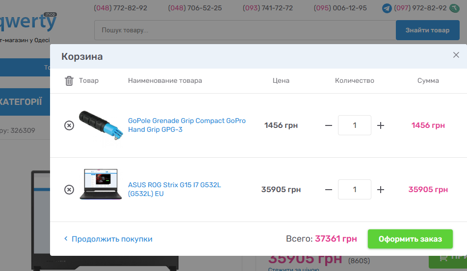 1) Перейти на сторінку будь-якого товару, який можна придбати (наприклад https://qwertyshop.ua/noutbuk-asus-rog-strix-g15-i7-g532l-g532l-eu-326309)