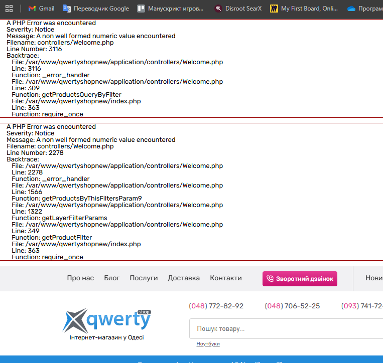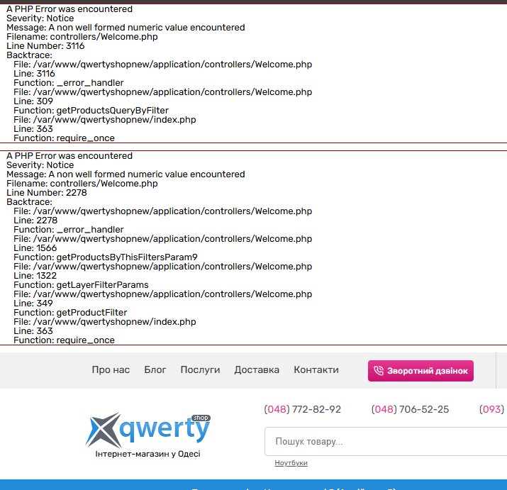Введеня будь-яких значень окрім цілих чисел у поле фільтру по ціні викликає PHP Error на сторнці категорії на сайті qwertyshop.ua