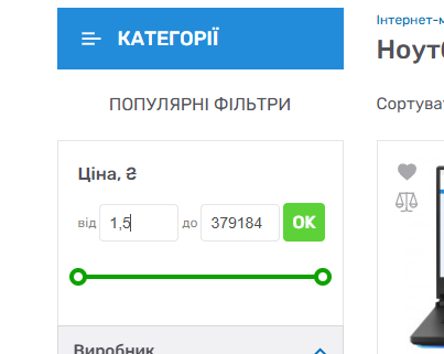 2) Вписати у поле "від" або "до" під "Ціна" значення "1,5"