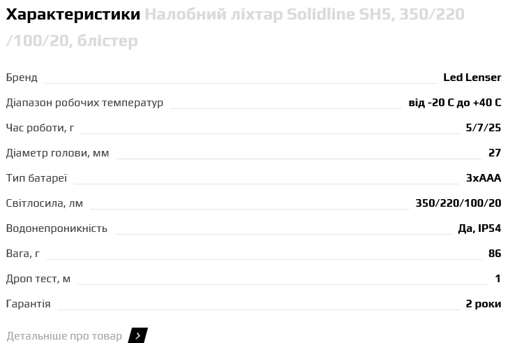 5) Проскроліти до "Характеристики" Налобний ліхтар Solidline SH5, 350/220/100/20, блістер