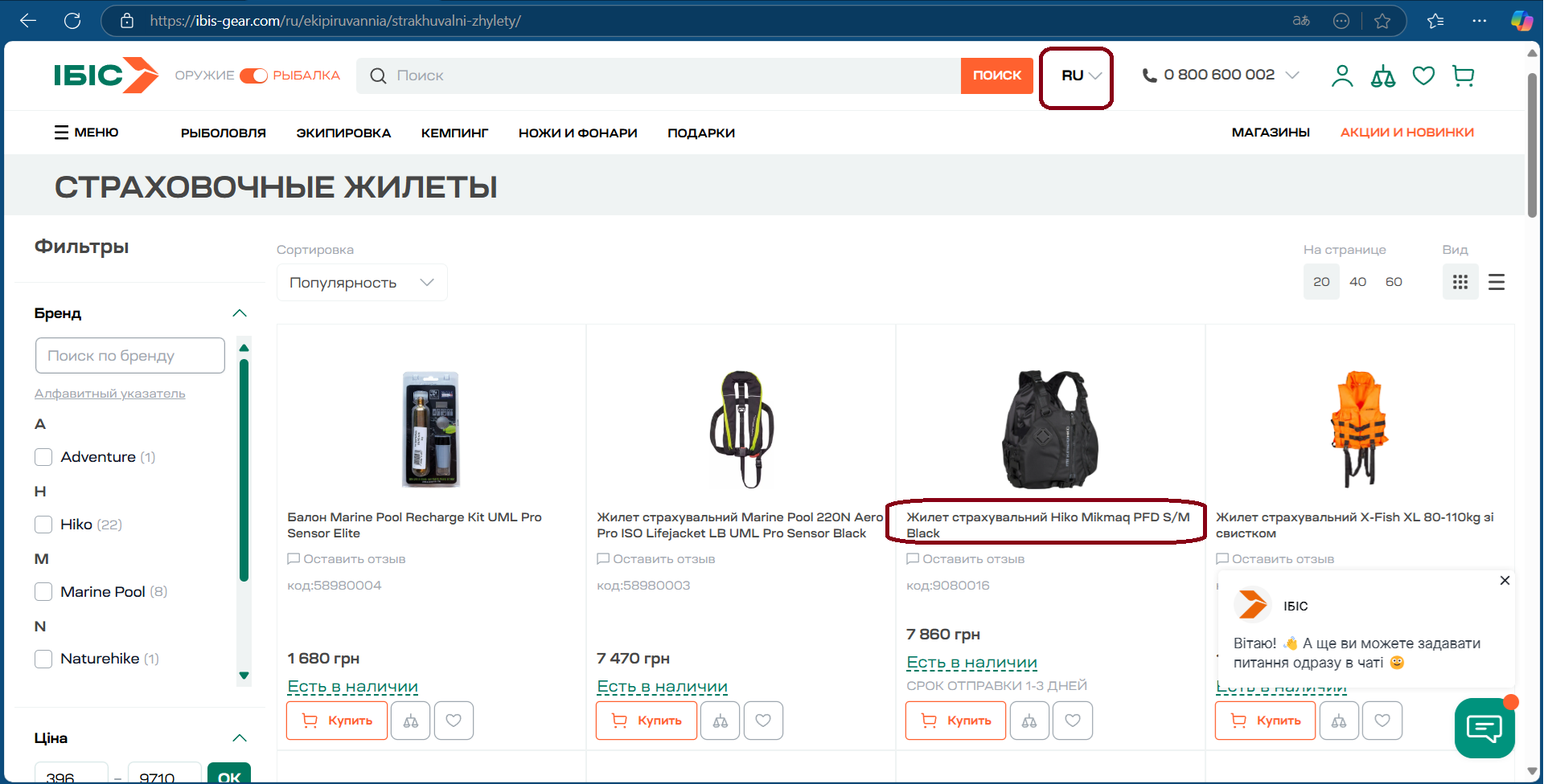 Помилка локалізації назв товару на сторінці "Страховочные жилеты"