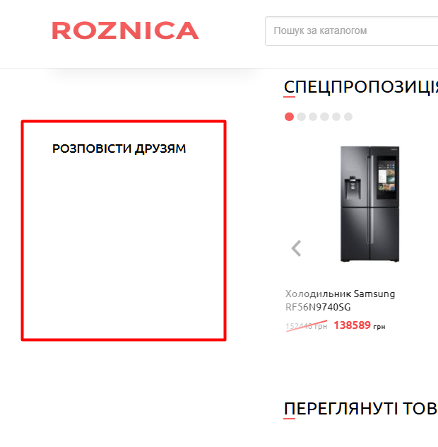 Опис: Не активний розділ "Розповісти друзям" на головній сторінці