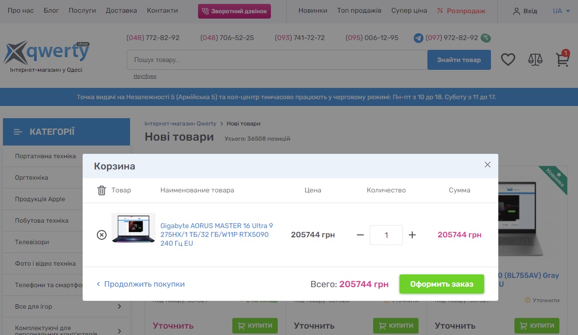 Всплывающее меню корзины на русском языке в украинской раскладке сайта