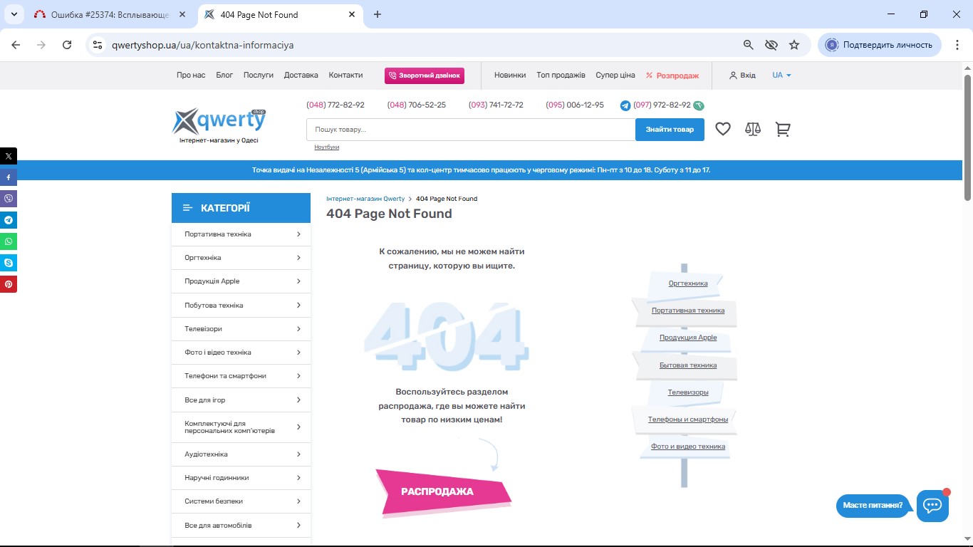 Помилка 404 за посиланням "Контакти" в україномовній версії сайту (Rare баг).