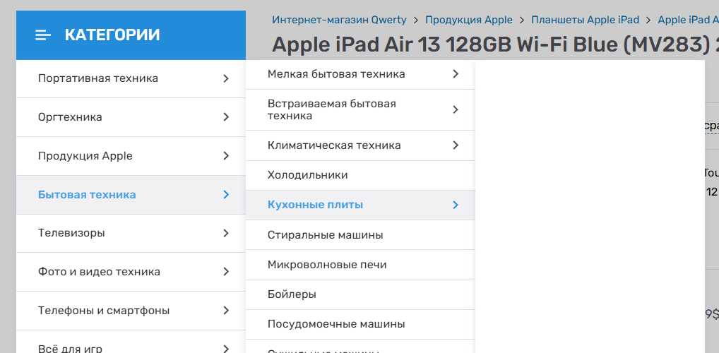 Expected result: В категории "Кухонные плиты" нет стрелки, ведущей к подкатегориям, либо есть подкатегории