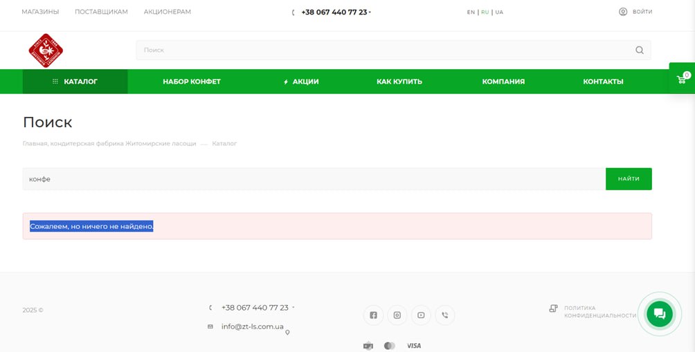 2) Написать в Поисковой строке неполное название товара, например: "цукер" для украинского интерфейса сайта, или “конфе” для русского интерфейса сайта, или "swee" для английского интерфейса сайта