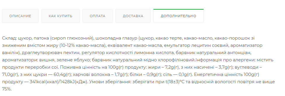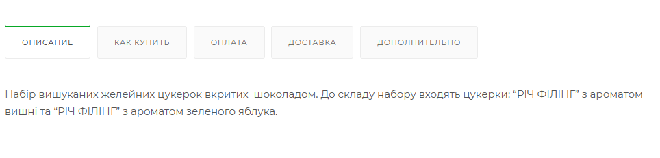 Текст написан на украинском языке во вкладках "Описание" и "Дополнительно" в товаре Набір цукерок "РІЧ ФІЛІНГ" в RU версии сайта