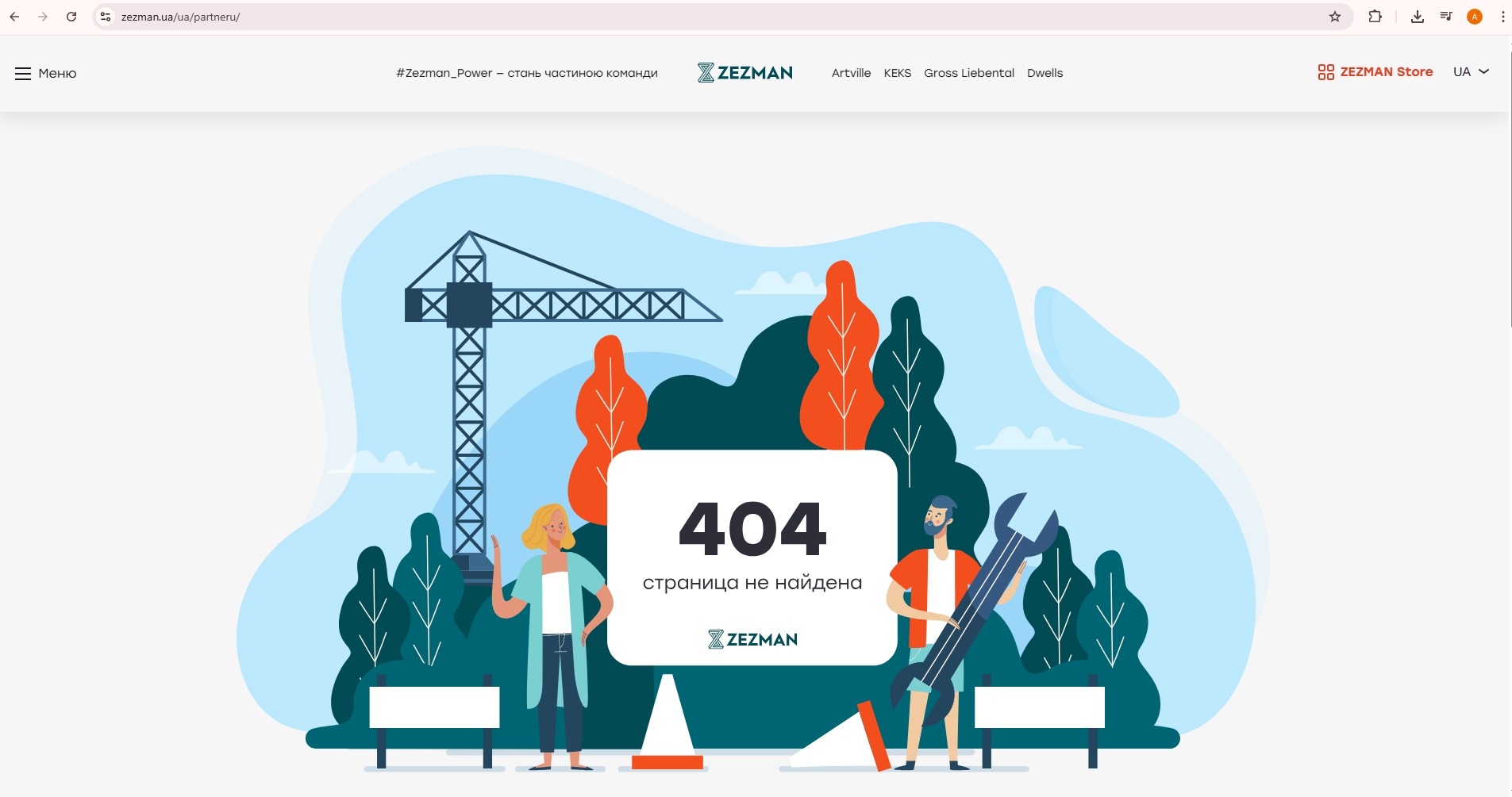 При спробі перейти на сторінку "Партнери" на сайті ZEZMAN, користувач бачить помилку 404 — страница не найдена. Це означає, що сторінка або була видалена, або відсутній правильний маршрут до неї.