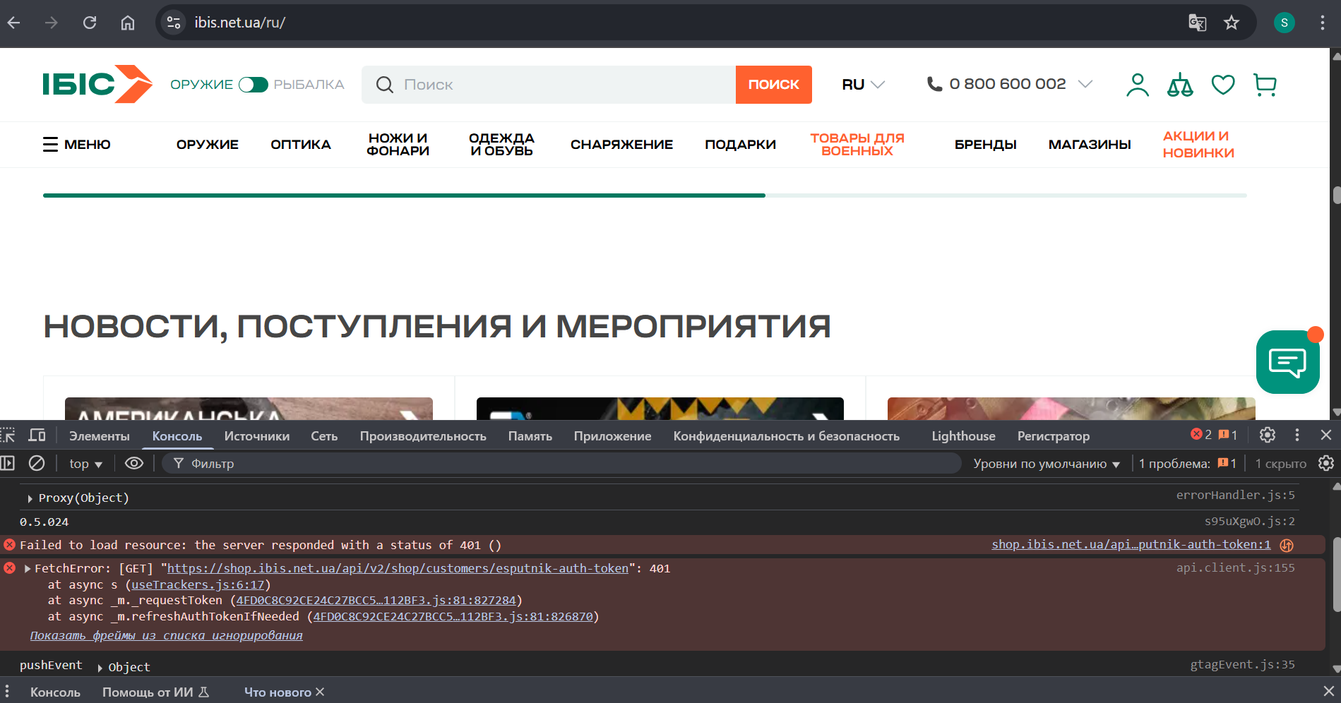 При открытии сайта (ibis.net.ua) в консоли браузера отображается ошибка 401.