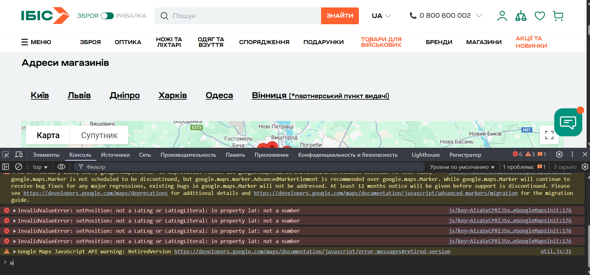 Ошибки Google Maps API на странице "Адреса магазинов" (https://ibis.net.ua).