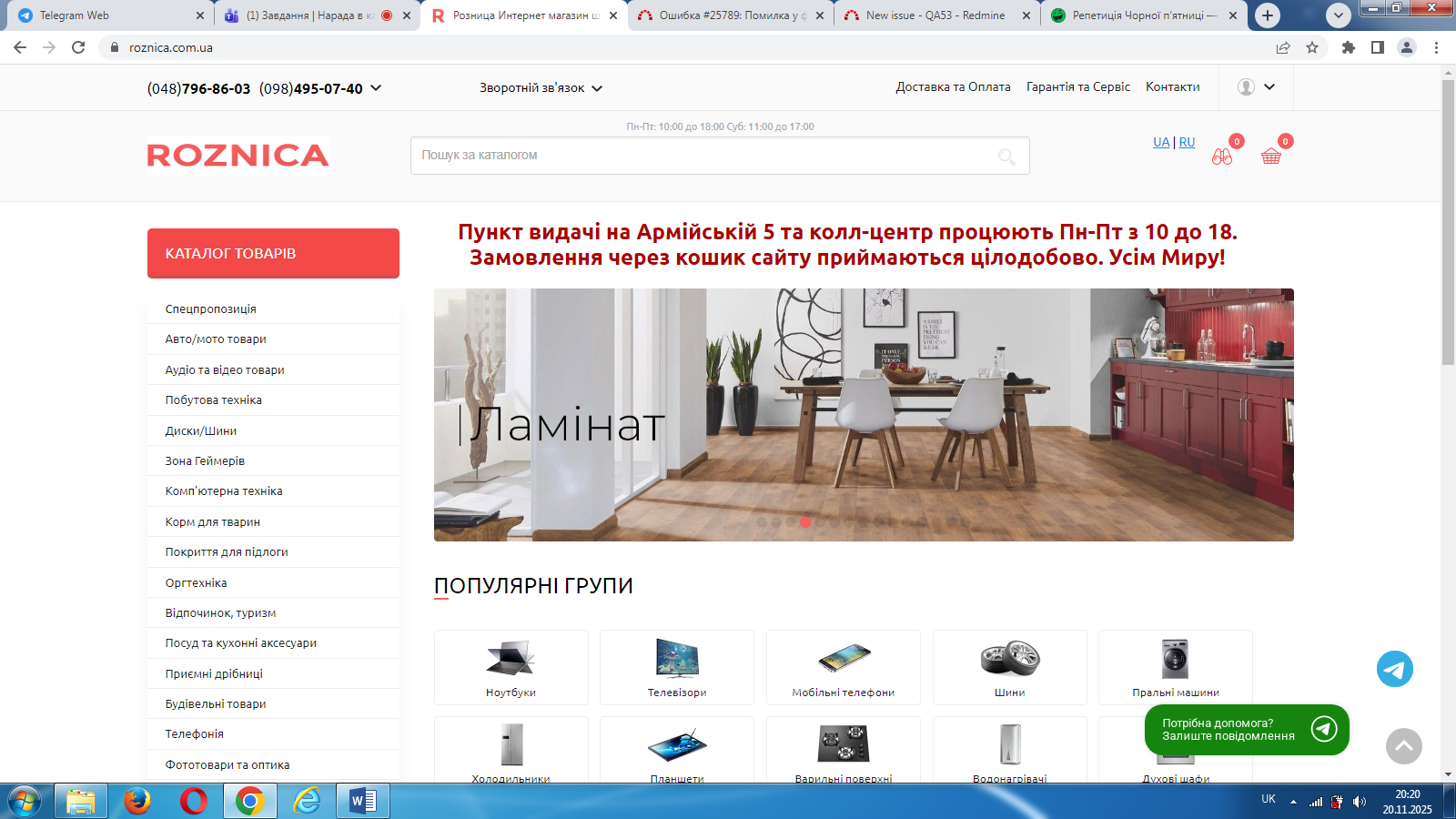Expected result: наявність повідомлення "Пункт видачі на Армійській 5 та колл-центр процюють Пн-Пт з 10 до 18. Замовлення через кошик сайту приймаються цілодобово. Усім Миру!"
