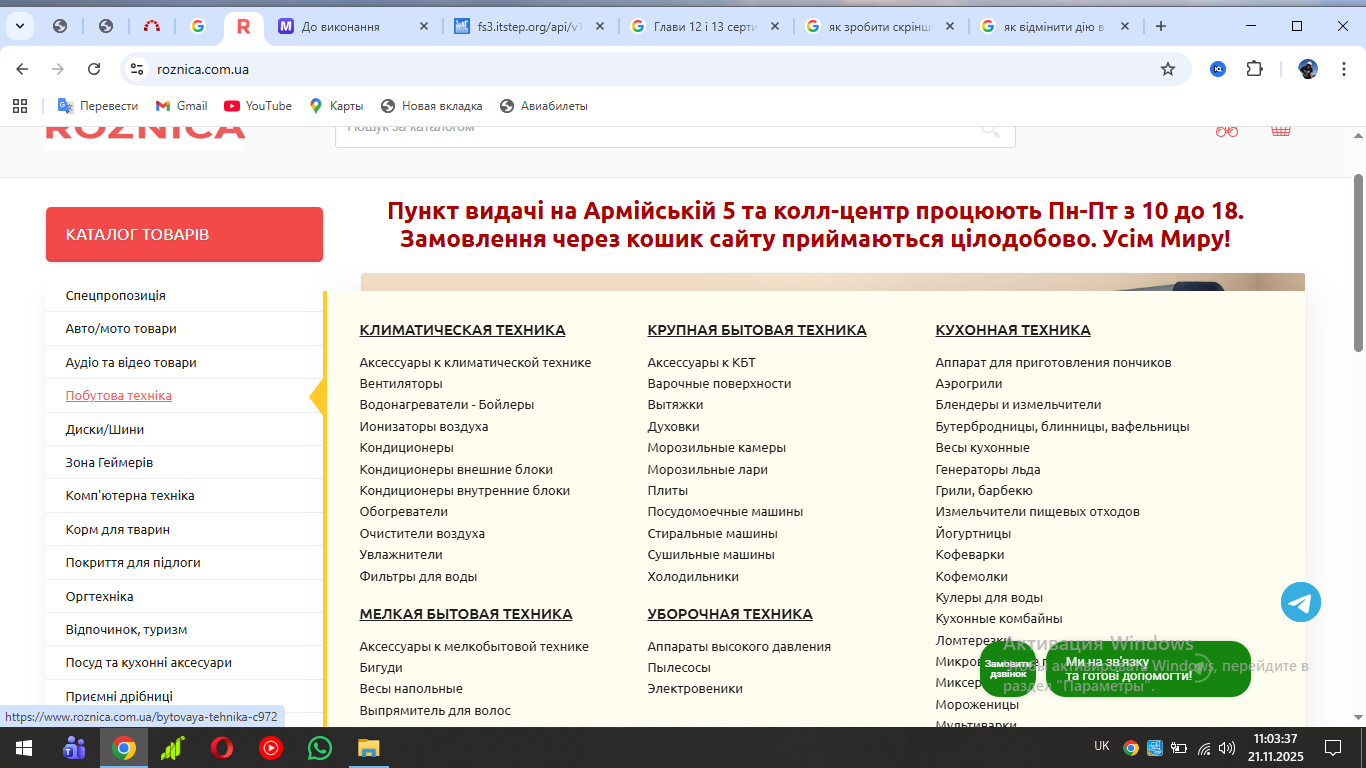 3) в меню (КАТАЛОГ ТОВАРІВ) навести курсор на будь-який розділ товарів