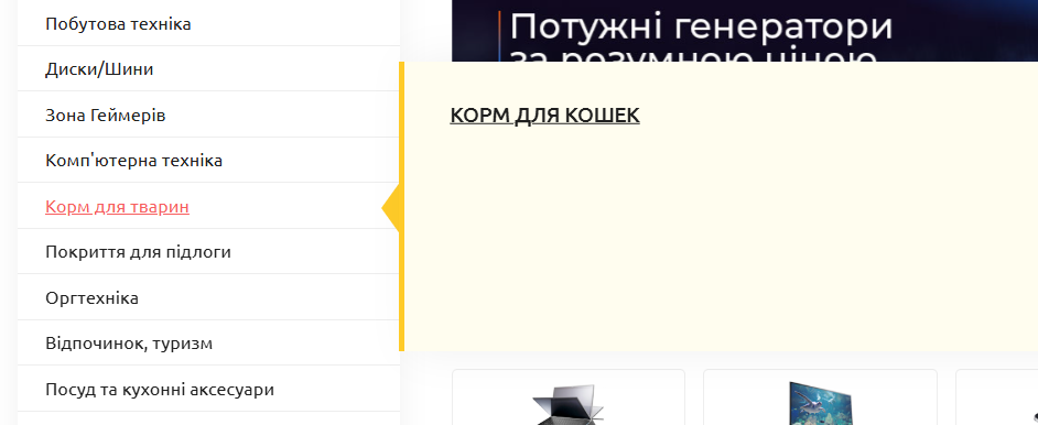 Expected result : Перехід на сторінку з пропонованим кормом для кошек