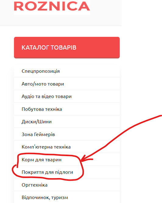 Посилання "Корм для тварин" та "Покриття для підлоги" у каталозі товарів зліва не працюють