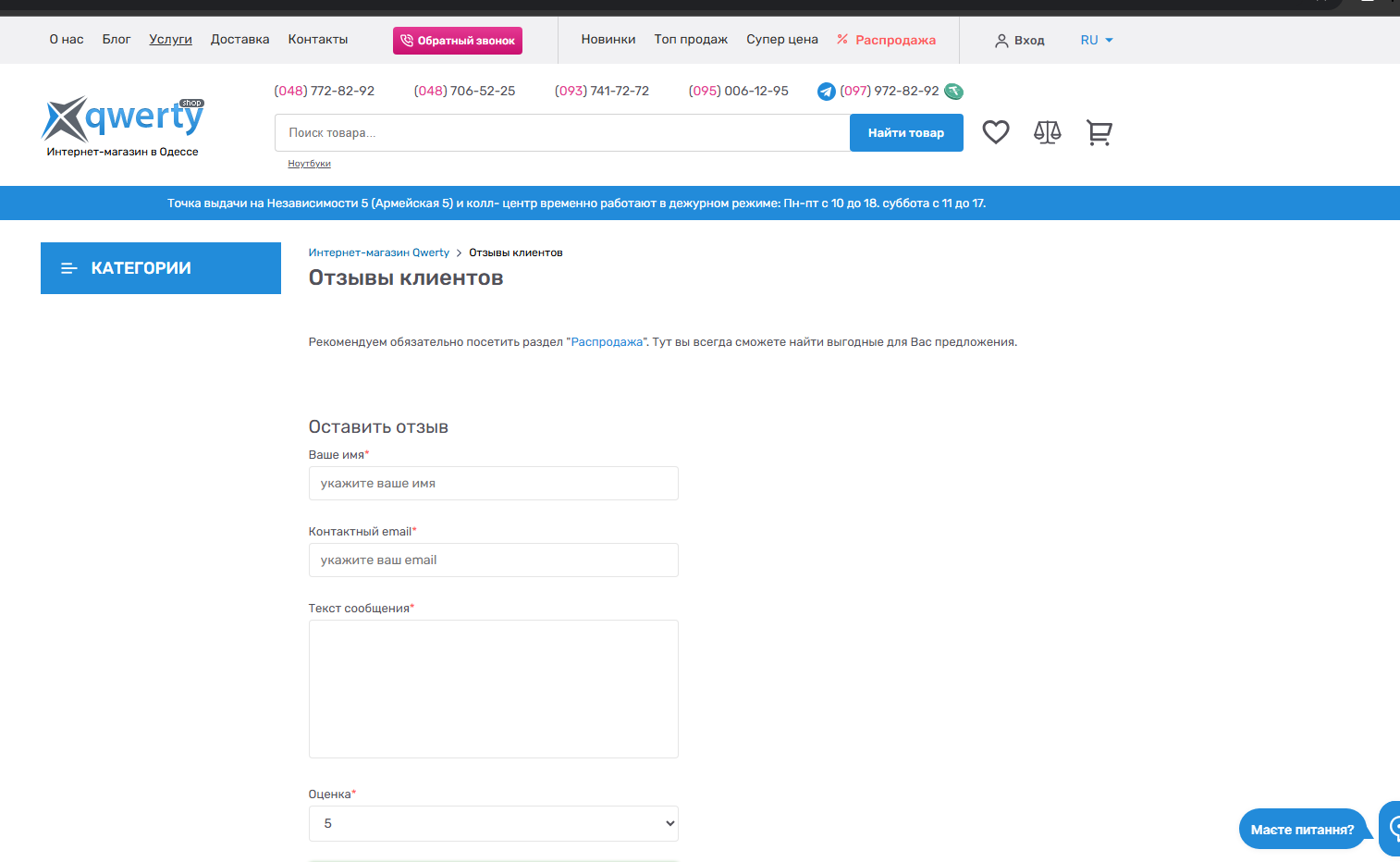 Кнопка " о нас" в хедері сайту відкриває сторінку "отзывы клиентов"