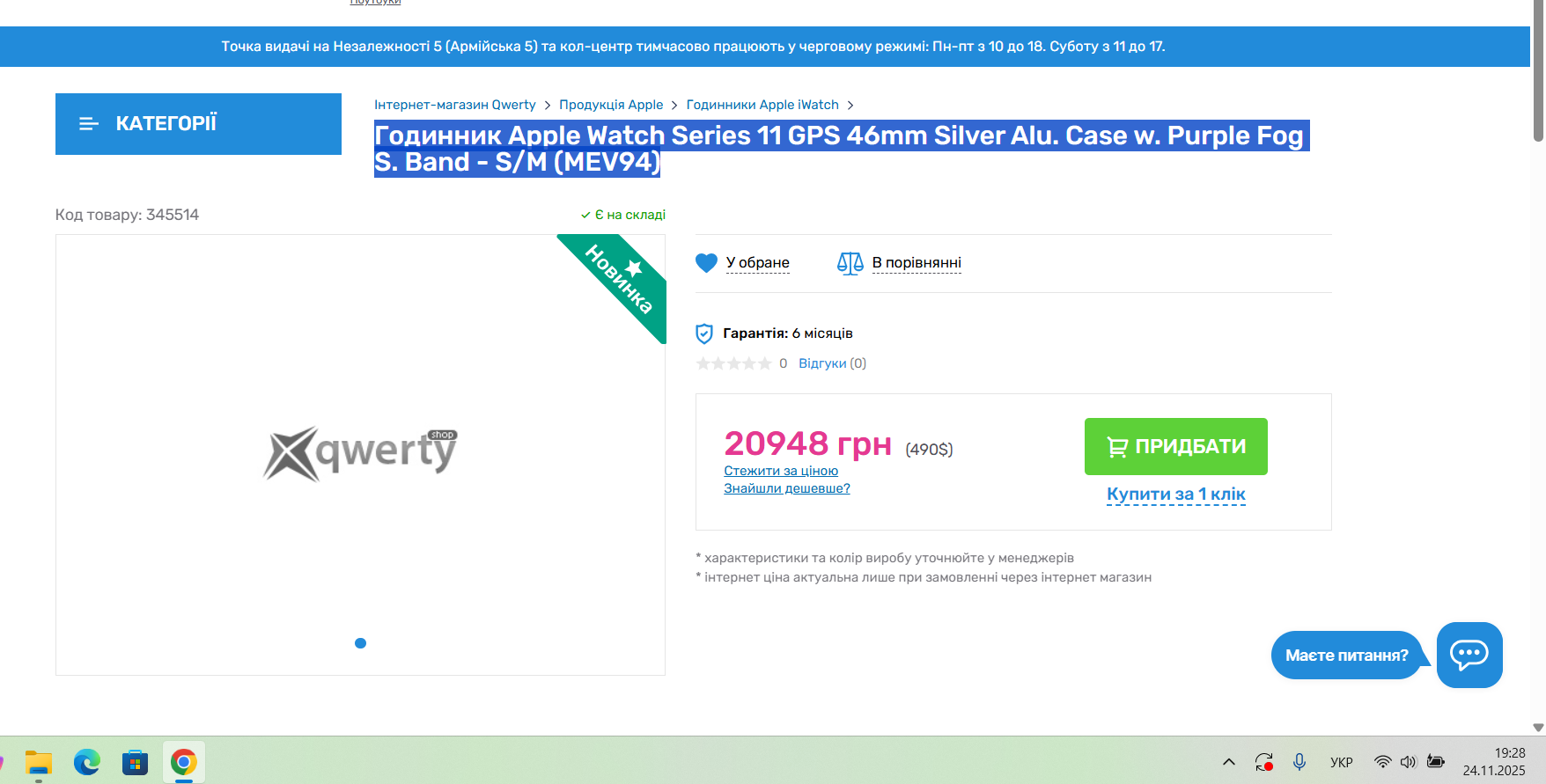 3)Знайти товар Годинник Apple Watch Series 11 GPS 46mm Silver Alu. Case w. Purple Fog S. Band - S/M (MEV94)