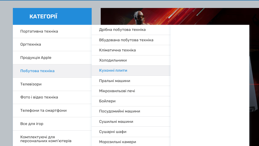 2) Вибрати в випадаючому списку зліва категорію "Побутова техніка" - "Кухонні плити"