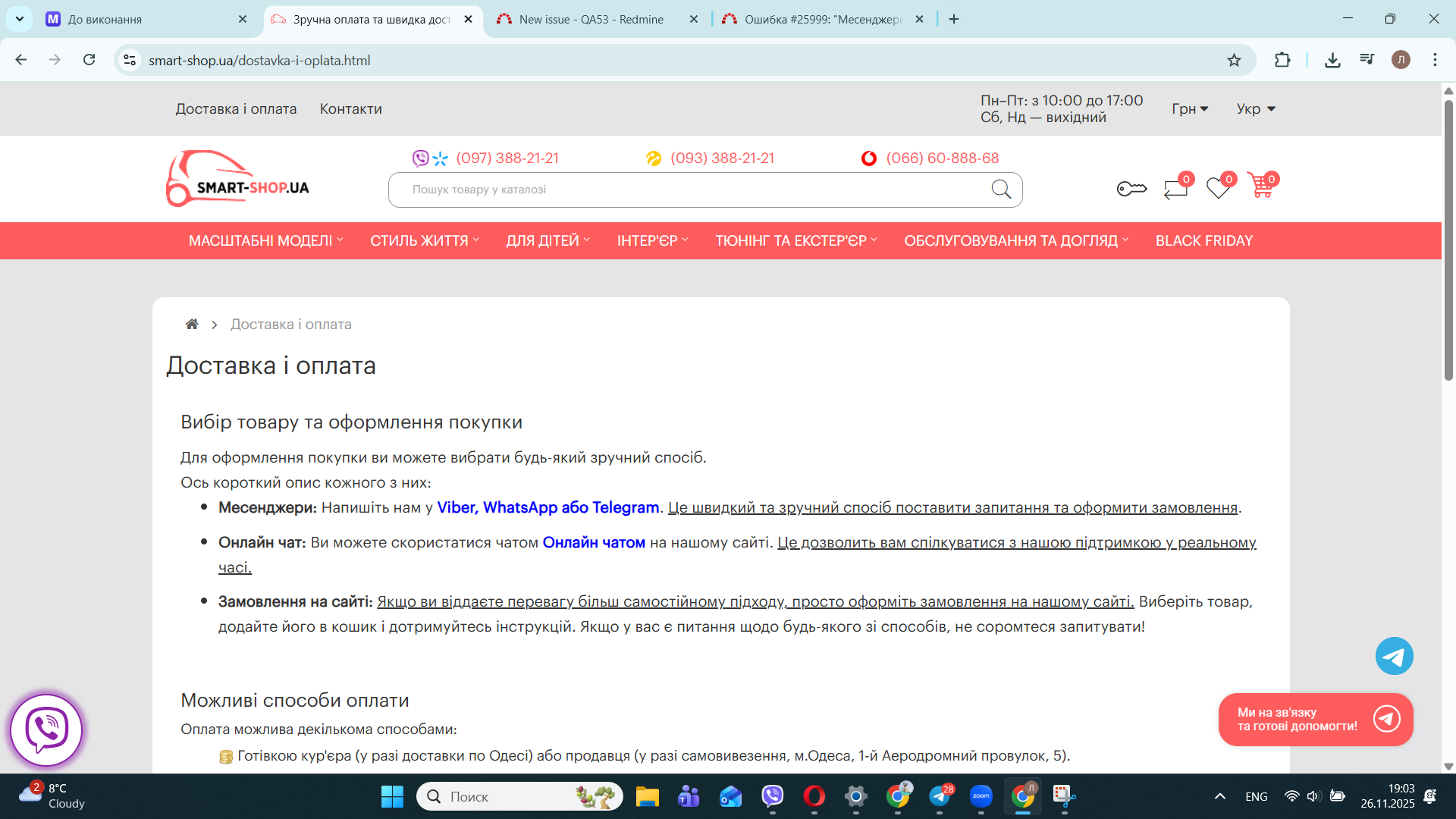 Actual result:"Месенджери Viber, WhatsApp або Telegram" в разделе Доставка и оплата -не активные