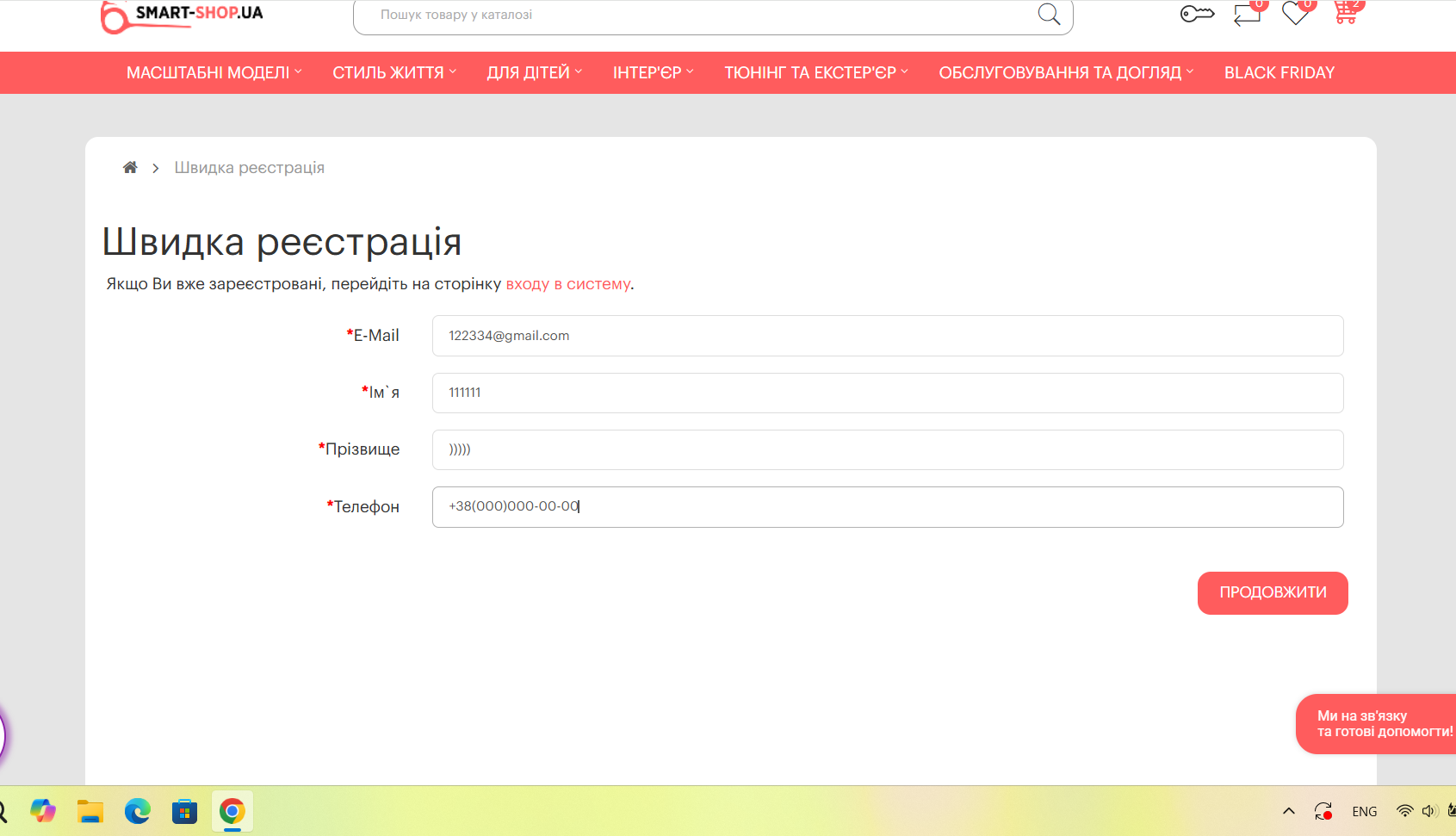 Реєстрація доступна тільки під час оформлення замовлення і форма реєстрації приймає повністю некоректні дані ( телефон, ім'я, прізвище, email)