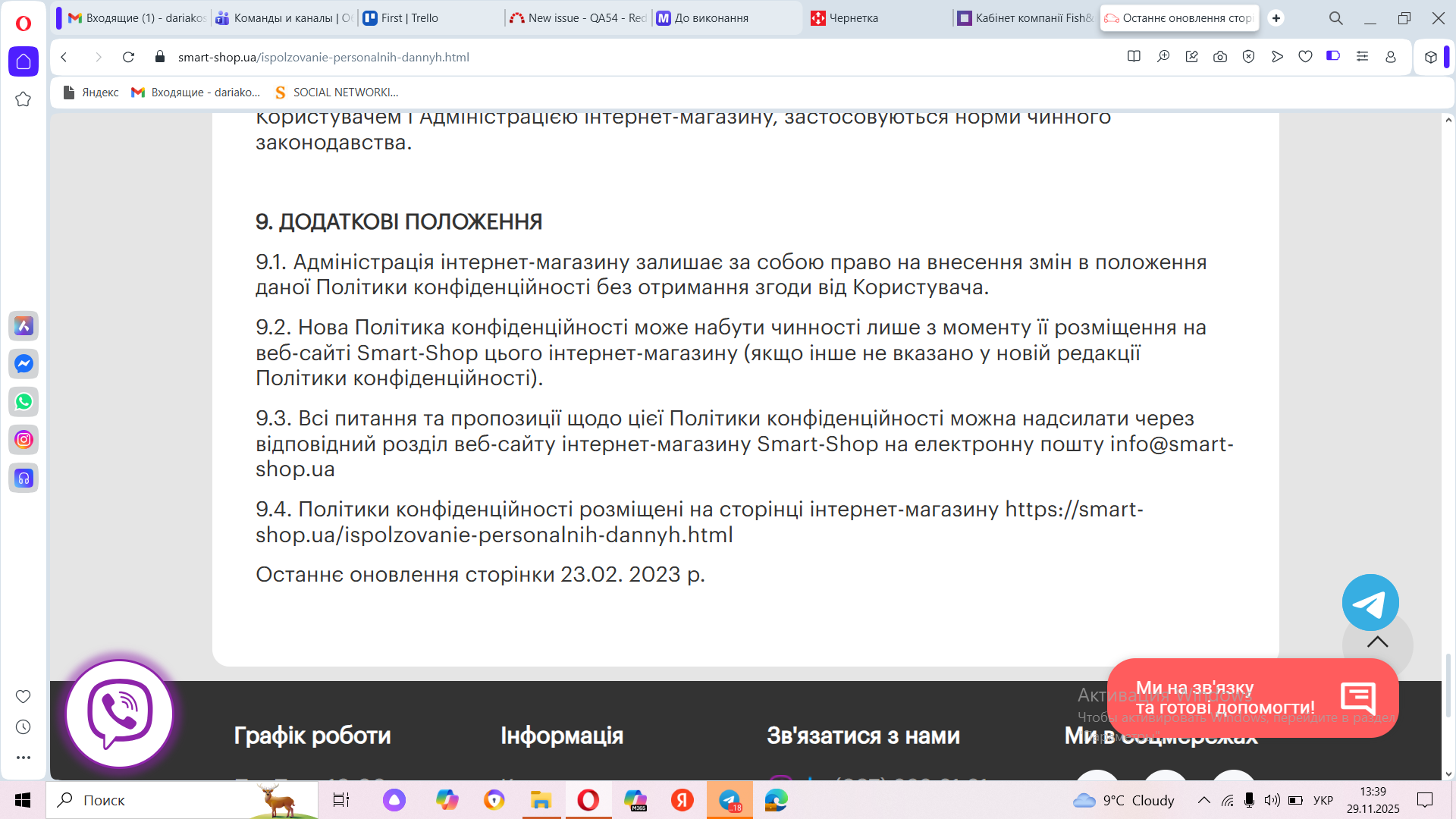 Expected result: Посилання "info@smart-shop.ua" в розділі "Інформація" в підроздлі "Політика конфіденційності" в пункті 9 "Додаткові положення" в підпункті 9.3 відображається коректно