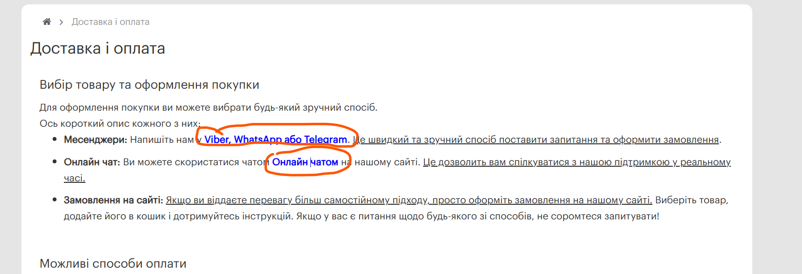 У розділі "Доставка та оплата" посилання на месенджери не активні