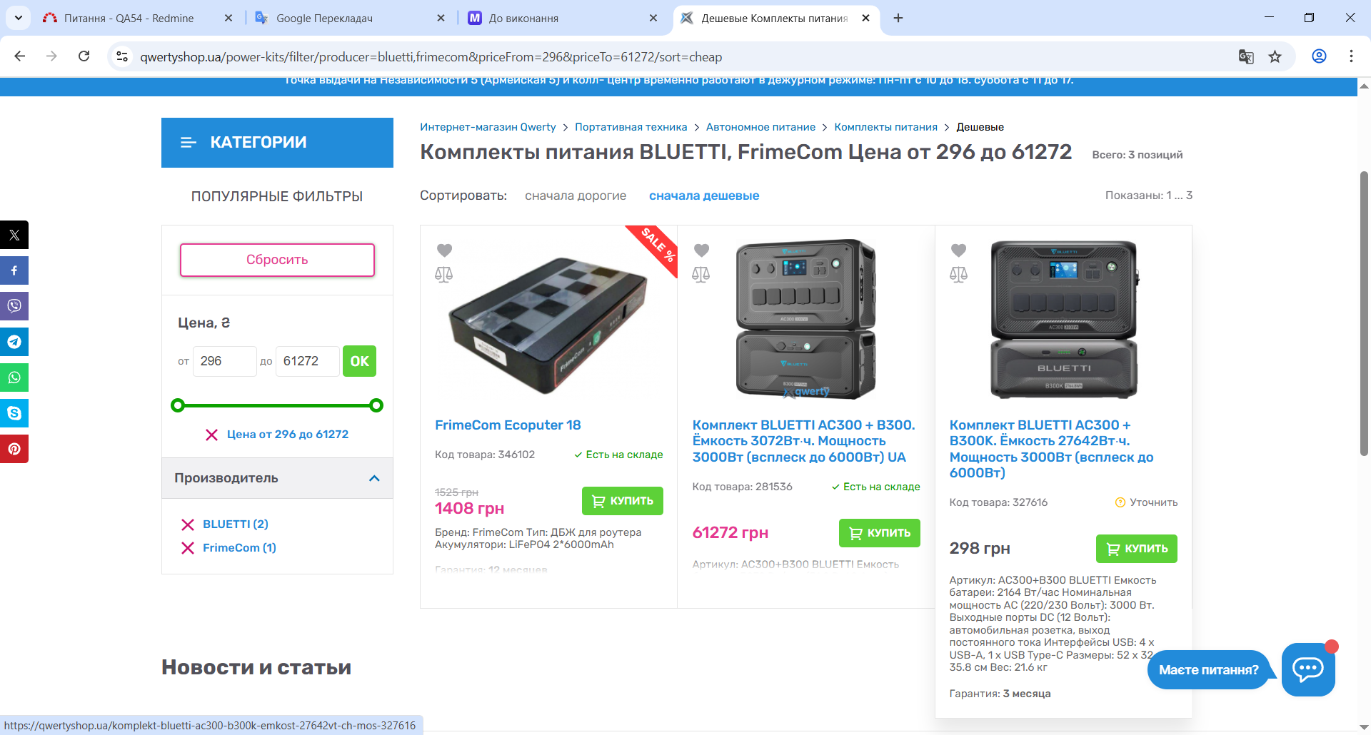Actual result: при натисканні кнопки "сначала дешевые" фільту "Сортировать" в хедері сторінки при оновленні сторінки найдешевший елемент "Комплект BLUETTI AC300 + B300K. Ёмкость 27642Вт⋅ч. Мощность 3000Вт (всплеск до 6000Вт)" відображається останнім