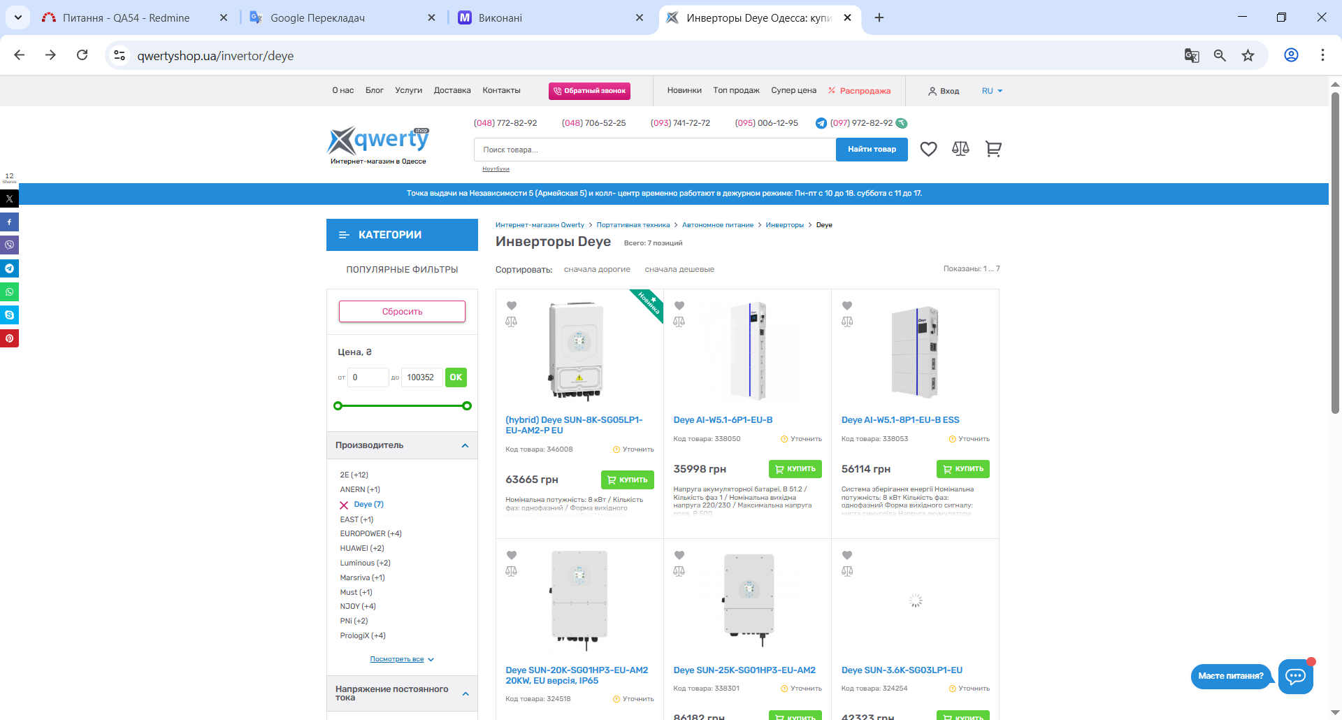 Expected result: при виборі елементу "Deye" фільтру " Производитель " виконується оновлення сторінки з представленням превʹю і характеристик 7 елементів за визначеними фільтрами правилами. Індикатори процесу завантаження мають зникнути після завантаження елементів.
