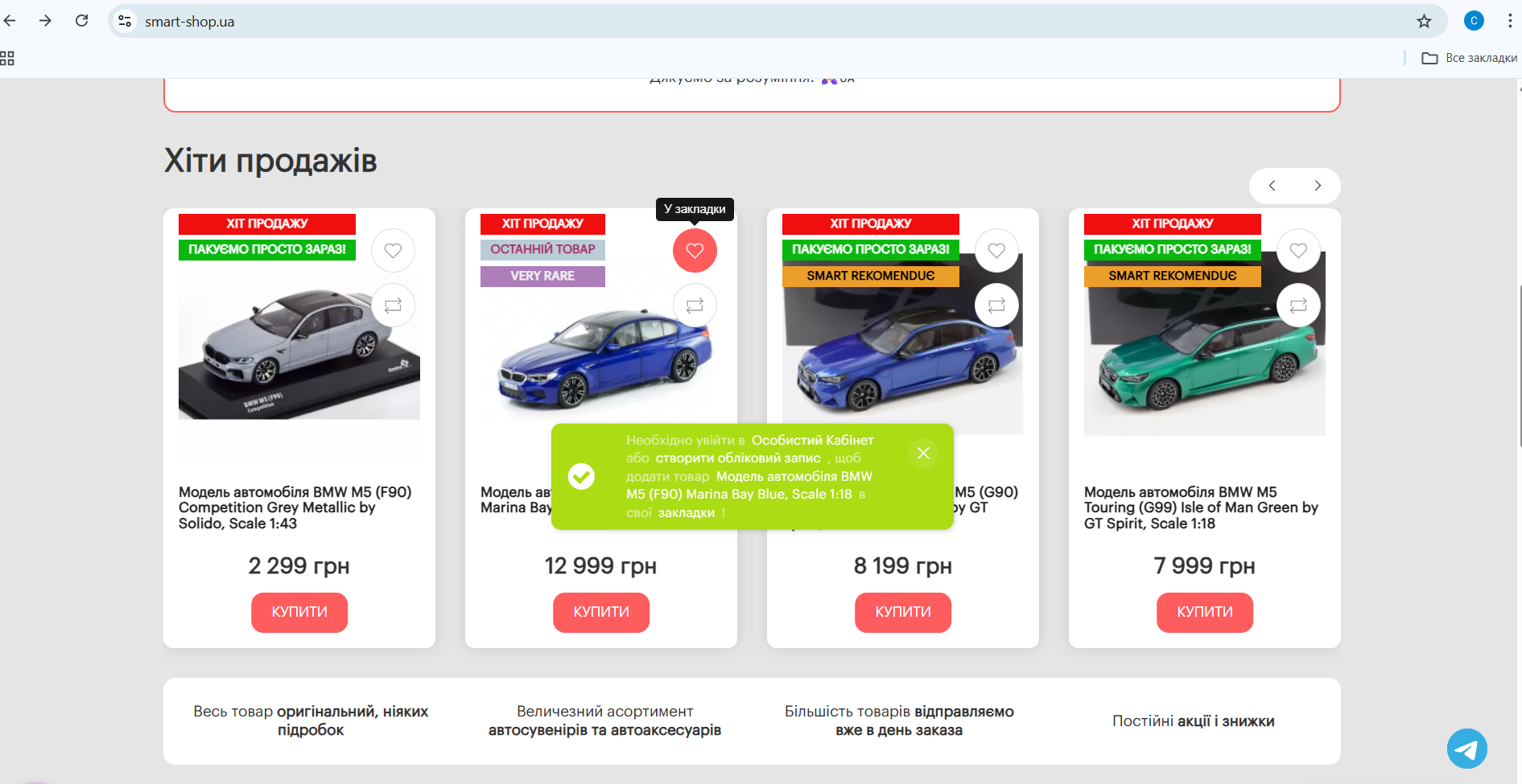 Неавторизований користувач не має можливості додати товар в розділ "у закладки"