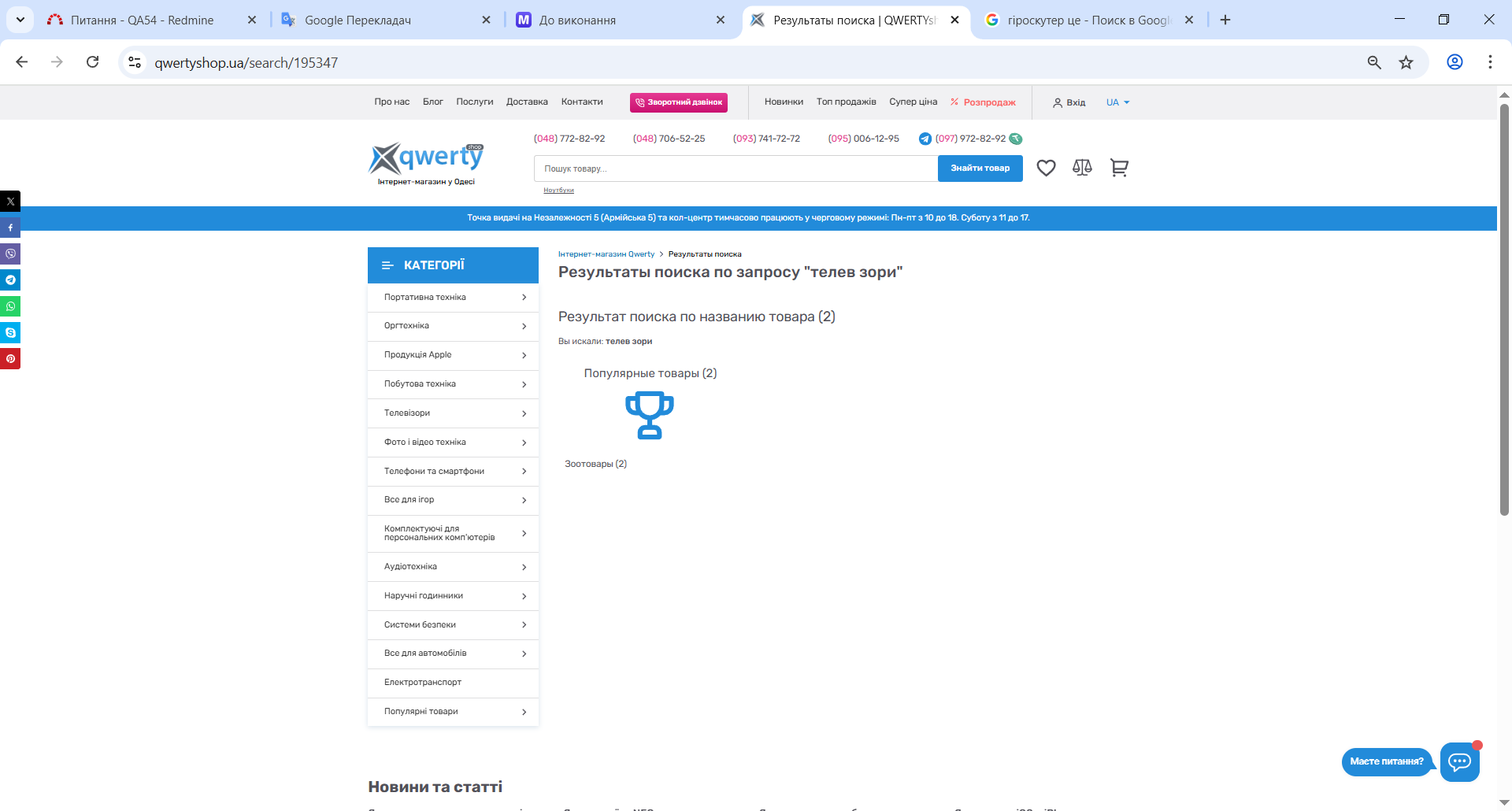 Actual result: при введенні "телевізори" в поле "пошук товару" пошукового рядка в хедері сайту і натисканні кнопки "знайти товар" результатом пошуку стали товари категорії "зоотовари" . Сповіщення: " Вы искали: телев зори"