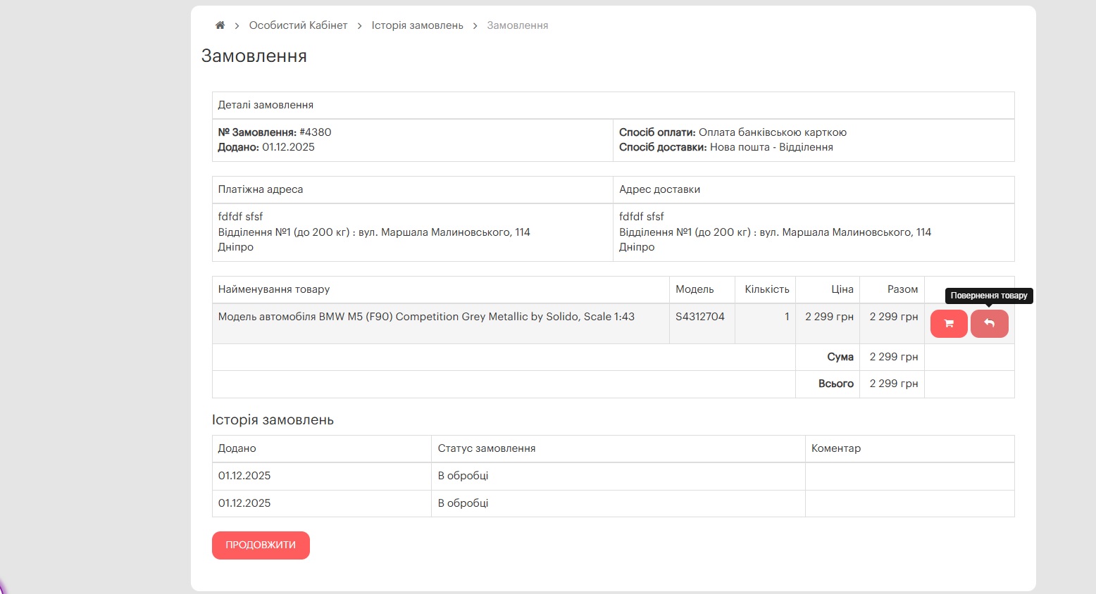 3) В разделе "Заказ" нажать на кнопку "Возврат товара"