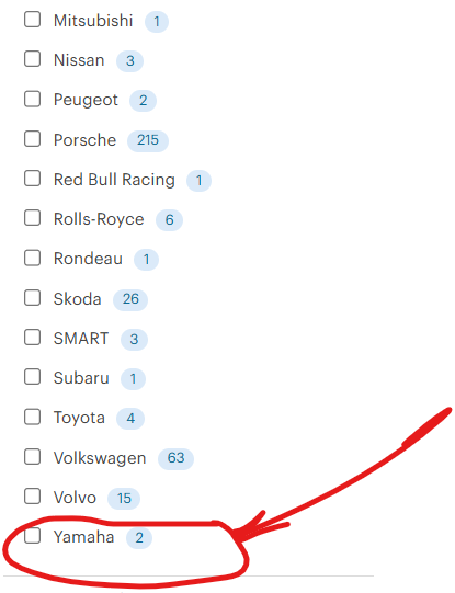 Кнопка переходу на виробника "Yamaha" в списку виробників зверху над товарами відсутня