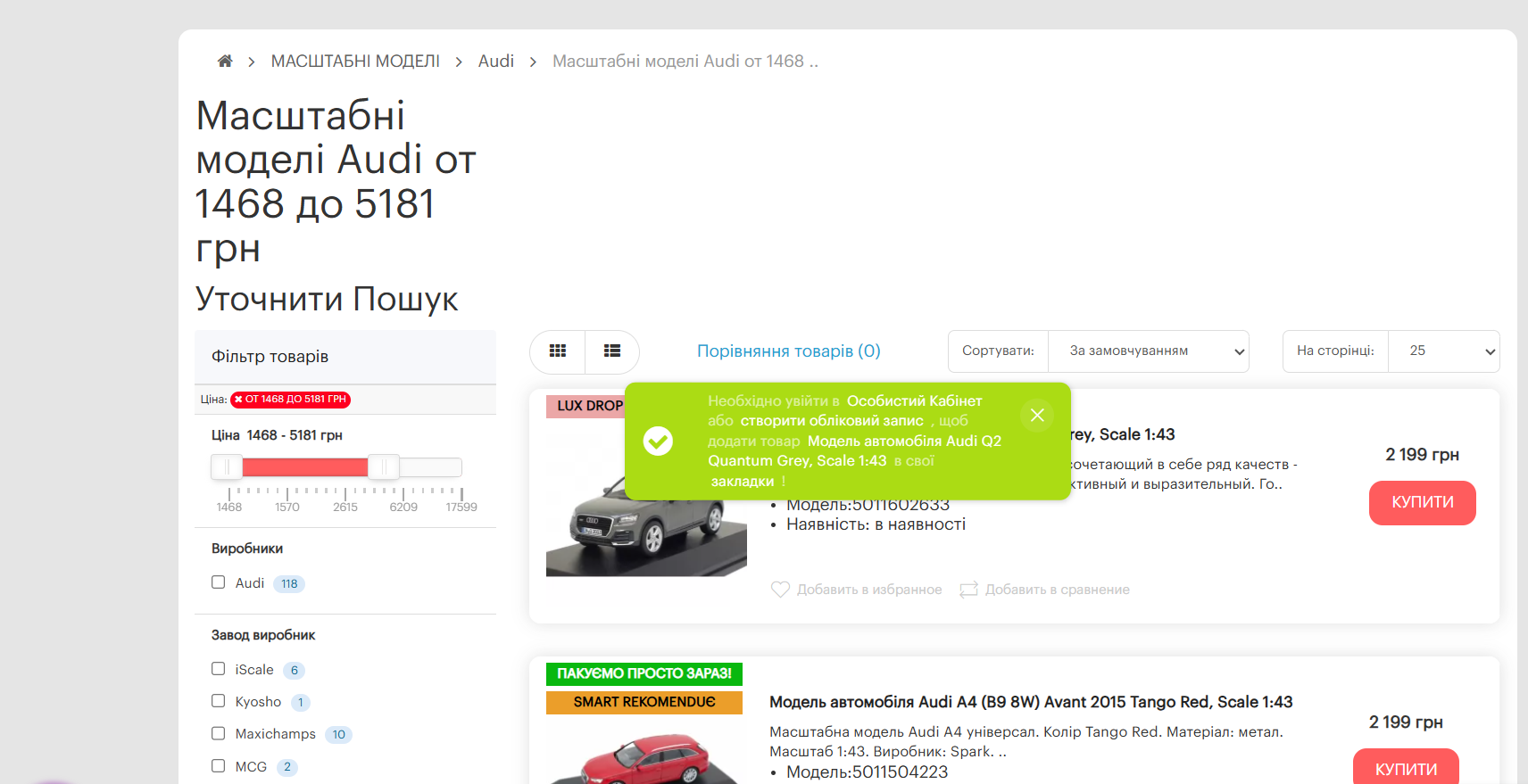 Неавторизований користувач має можливість додати товар у розділ "У закладки".