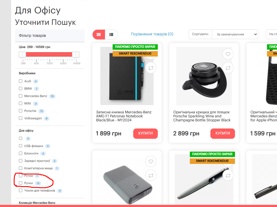 Дублювання назви фільтрів "Ручка" та "Ручки" у групі фільтрів "Для офісу"