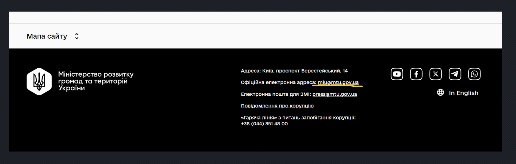 2) У футері сайту знайти посилання на офіційну адресу