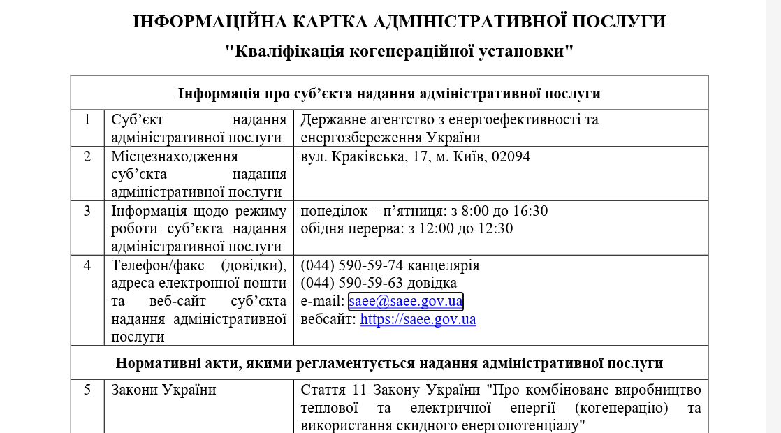 5)Отримати документ pdf з активним посиланням на сайт та електрнну пошту - Відкрити посилання "ІНФОРМАЦІЙНА КАРТКА АДМІНІСТРАТИВНОЇ ПОСЛУГИ "Кваліфікація когенераційної установки""