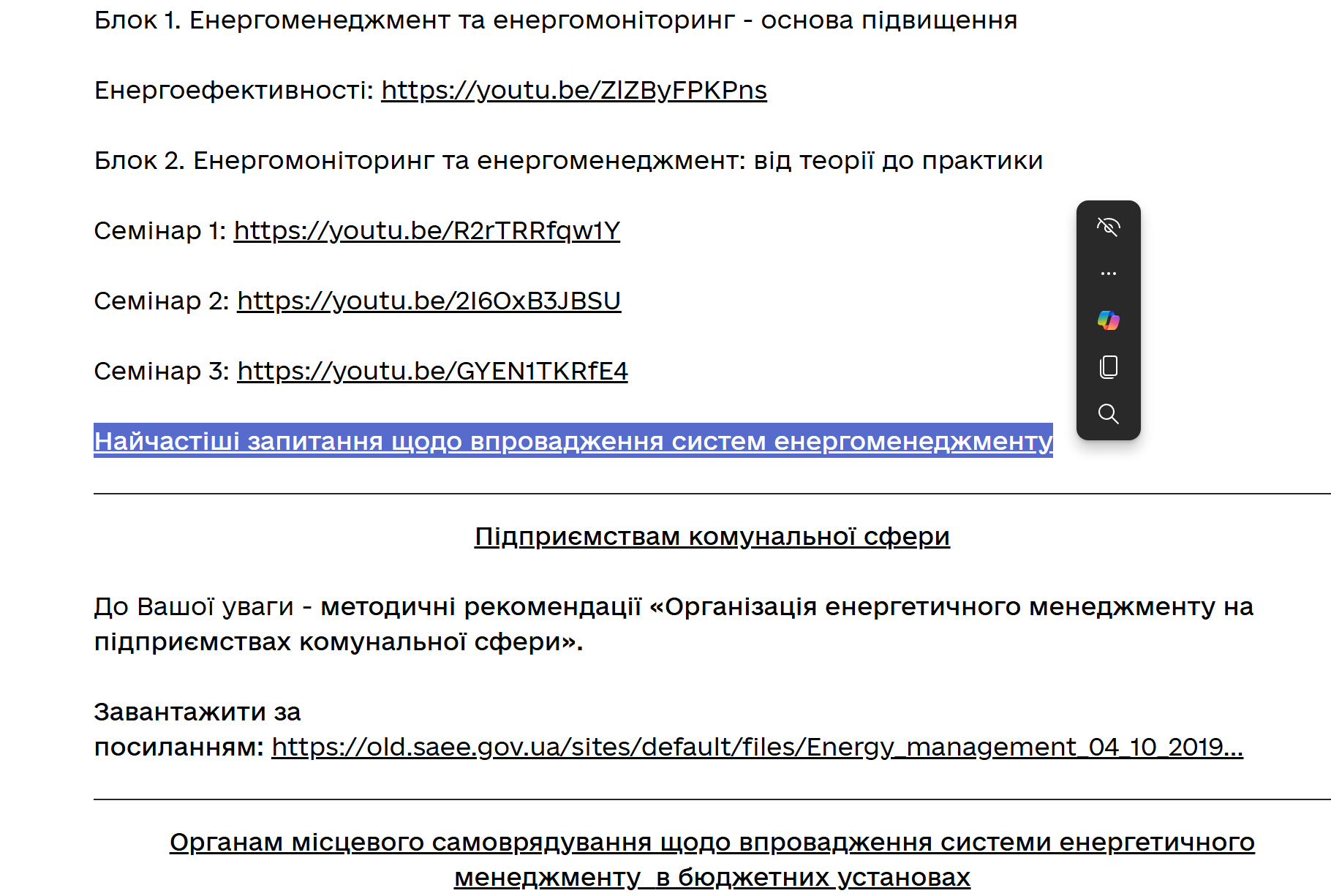 4. Прокрутити сторінку до статті "Найчастіші запитання щодо впровадження систем енергоменеджменту"