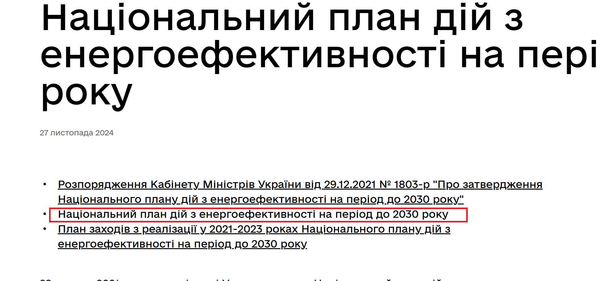 При натисненні на посилання "Національний план дій з енергоефективності на період до 2030 року" відкривається файл формату XML, в розділі "Діяльність", підрозділах "Енергоефективність" - "Національний план дій з енергоефективності на період до 2030"