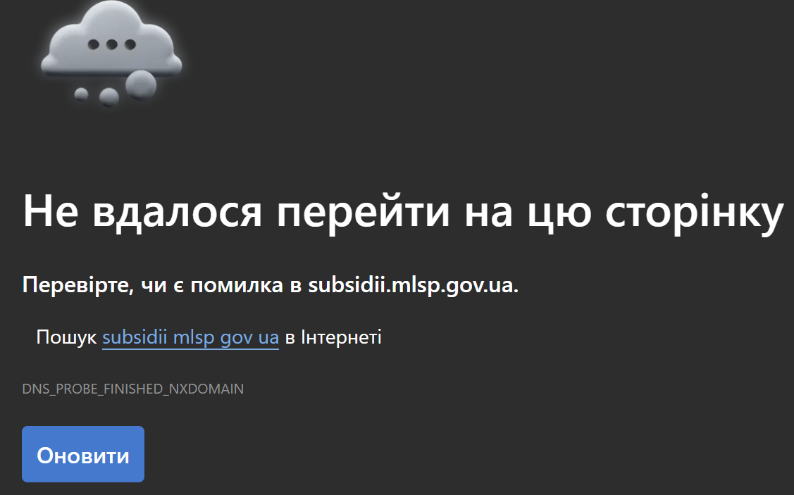 - Subject changed from Не коректне посилання на сайт для оформлення субсидії - subsidii.mlsp.gov.ua в розділі "Споживачам", підрозділах "Державна соціальна підтримка"- "Державна соціальна підтримка" to Посилання для оформлення субсидії веде на недоступний сайт - subsidii.mlsp.gov.ua в розділі "Споживачам", підрозділах "Державна соціальна підтримка"- "Державна соціальна підтримка"