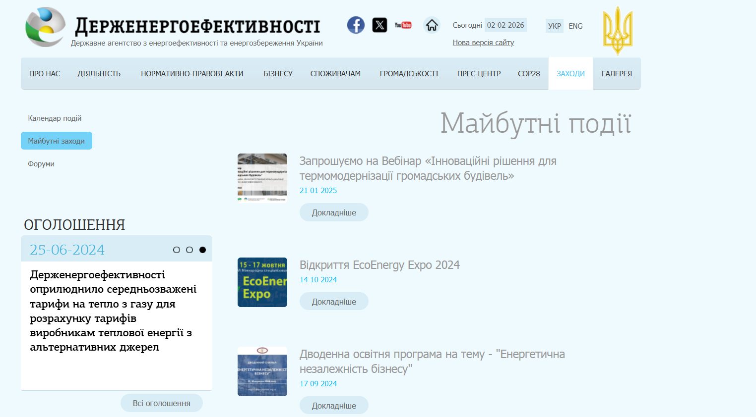 Expected result: Переход по ссылке "Предстоящие мероприятия" не ведет на страницу с ошибкой 404 в боди сайта "https://saee.gov.ua/ " при переходе на старую версию сайта