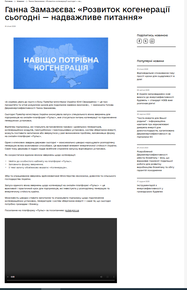 3) В розділі "Останні новини" клікнуть посилання "Ганна Замазєєва: «Розвиток когенерації сьогодні — надважливе питання»"