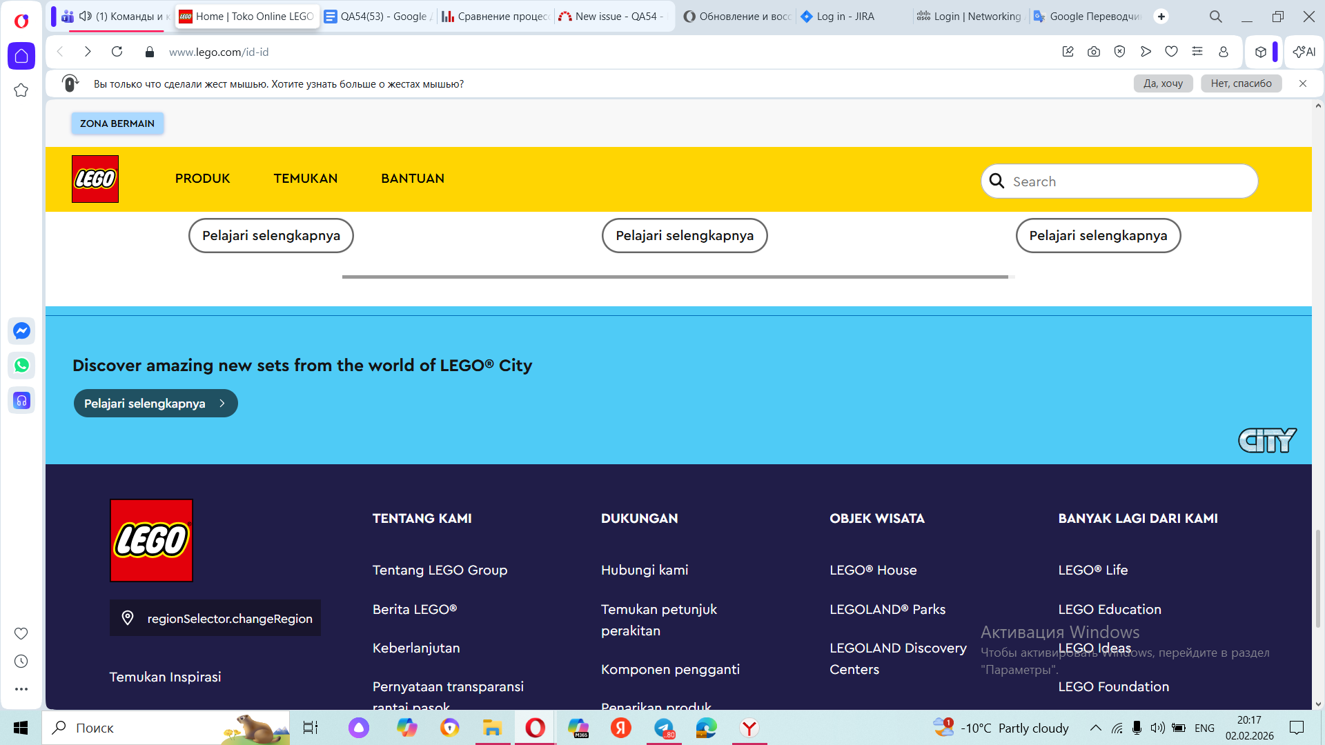 Actual result: Назва посилання "Discover amazing new sets from the world of LEGO® City" не перекладається при виборі індонезійської мови в футері сайту.