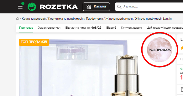 Реальный результат: Отсутствие элемента "Розпродаж" на фотографие товара