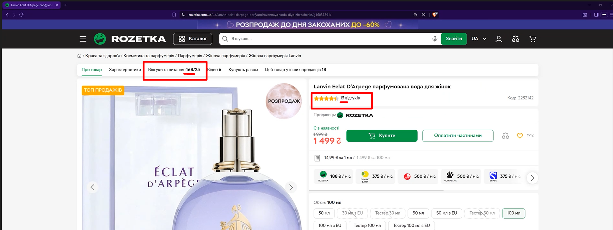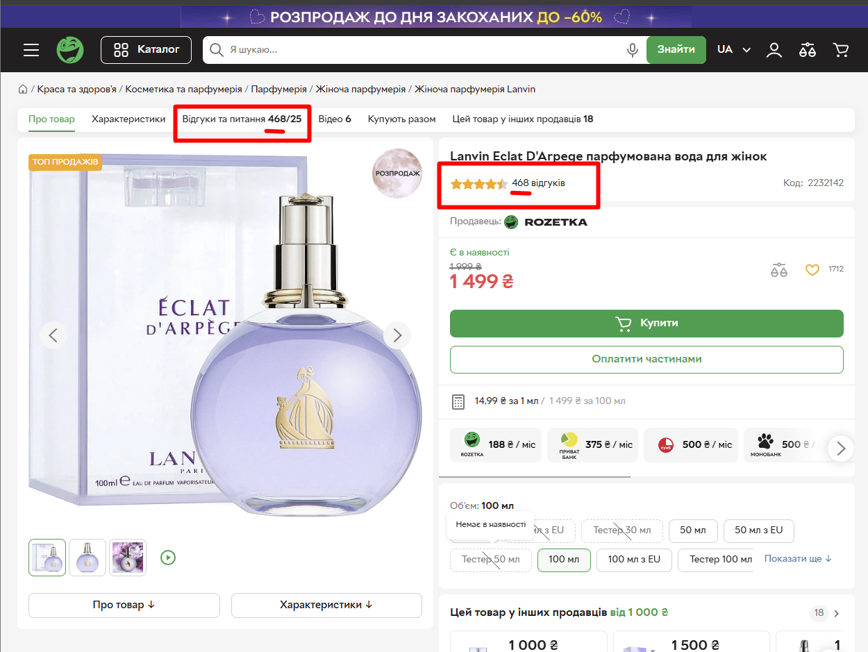 Не співпадає кількість відгуків між табом "Відгуки та питання 468/25" та біля рейтингу зірок 13 на сторінці товару "Lanvin Eclat D'Arpege парфумована вода для жінок" сайту rozetka.ua